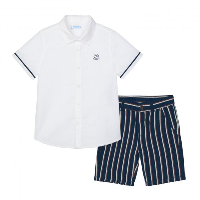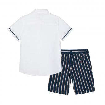 Schickes Sommer-Set mit  Bermuda-Hose und kurzarm Hemd  für Jungen aus dem Hause Mayoral. Hergestellt aus luftigem, strukturiertem Stoff, sodass ein angenehmer Tragekomfort entsteht. Die Hose ist mit seitlichen Eingriffstaschen ausgestattet, mit einer doppelten Steppnaht verziert und fühlt sich angenehm weich an. Vielseitig kombinierbar!
