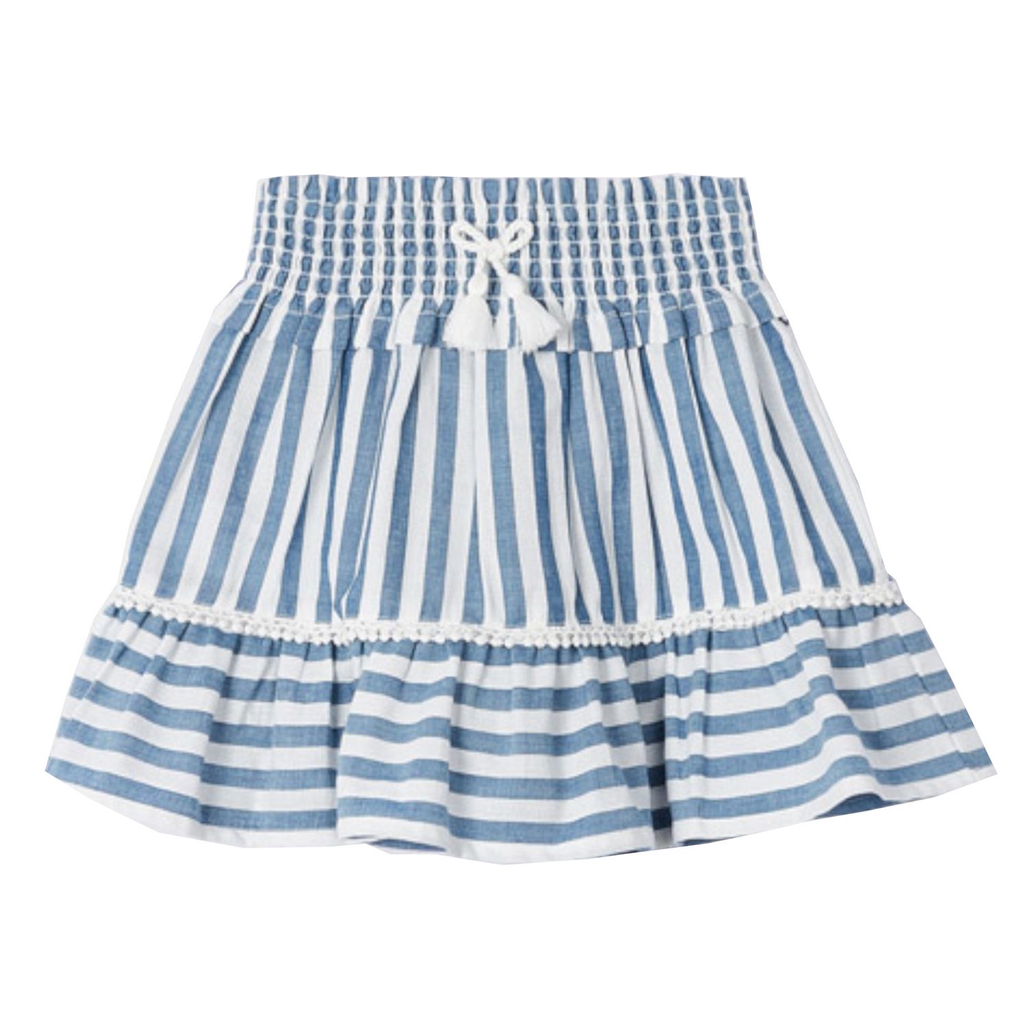 Dieser leichte, blau-weiß gestreifte Sommerrock für Mädchen ist aus 100% Baumwolle gefertigt und mit gesmokten Gummiibund ausgestattet.
