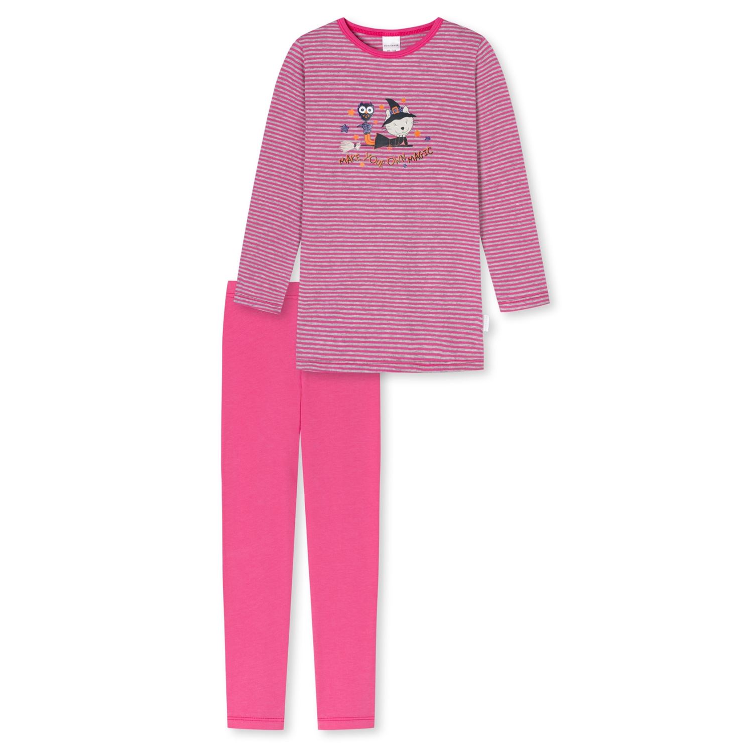 Dieser schöne, langärmelige Pyjama der beliebten Marke SCHIESSER überzeugt durch die Fertigung aus 100 % Baumwolle in feiner Jersey-Qualität und höchsten Tragekomfort. Durch sein hübsches Design mit einfabiger Hose und gestreiftem Oberteil mit farblich abgesetzten Zierschleife und tollem "Eule/ Hexe"-Motiv und "MAKE YOUR OWN MAGIC"-Schriftzug wird er schnell zum absoluten Liebling.