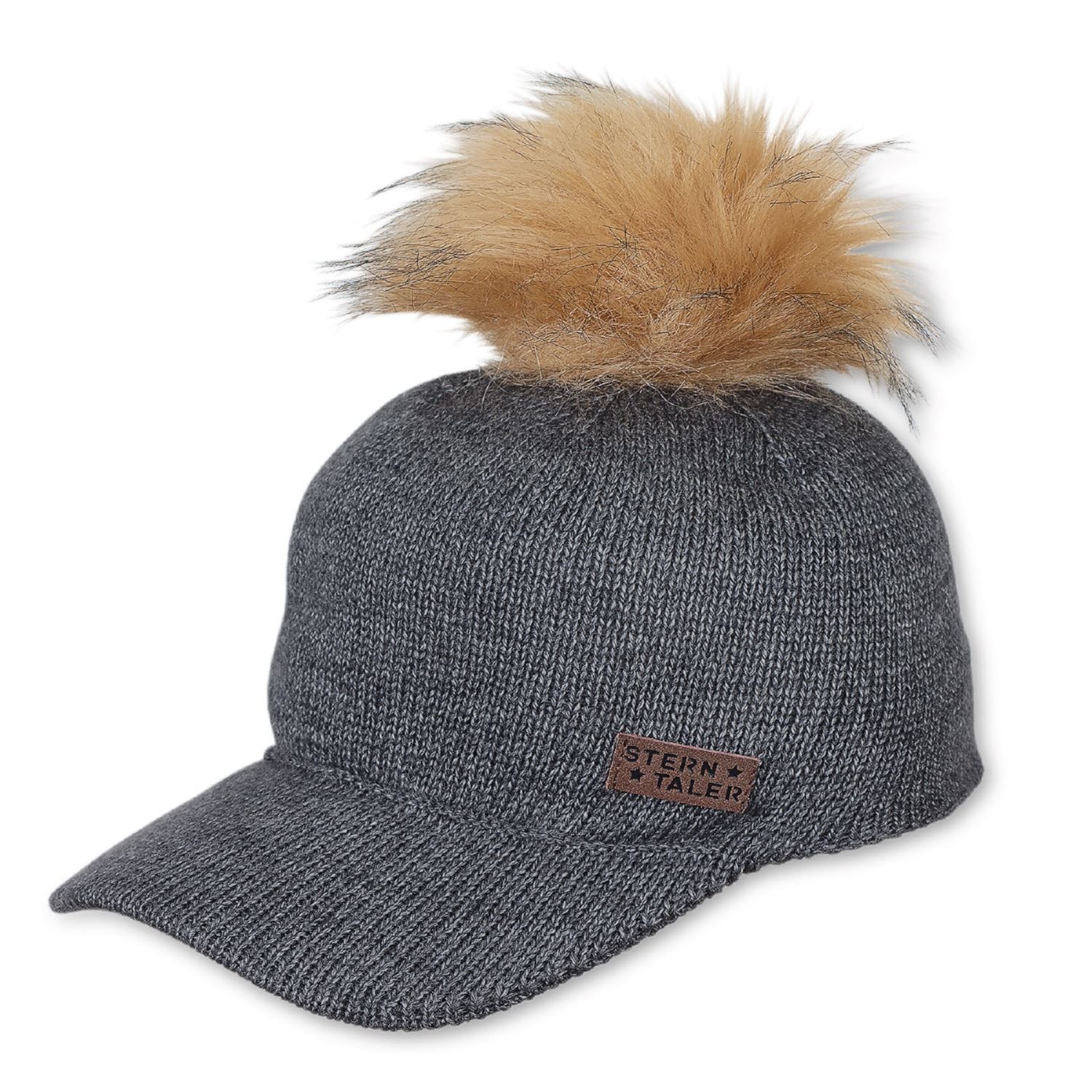 Jungen Mädchen Strickmütze mit Schirm Cappi mit Bommel aus Pelzimitat, grau...