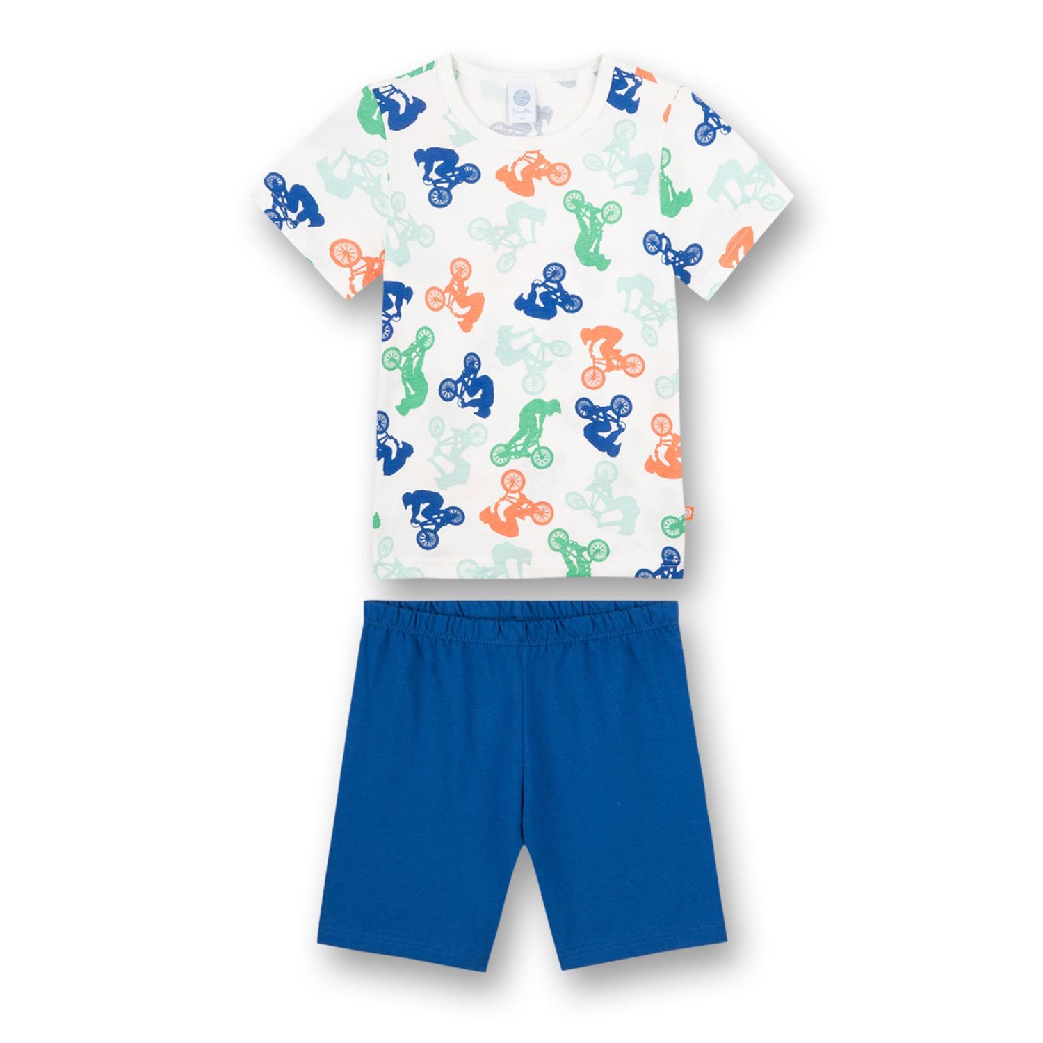 Kurzer Jungen-Schlafanzug mit coolen BMX-Muster von Sanetta. Der sportliche Pyjama ist aus 100% Baumwolle und ideal für warme Sommernächte.