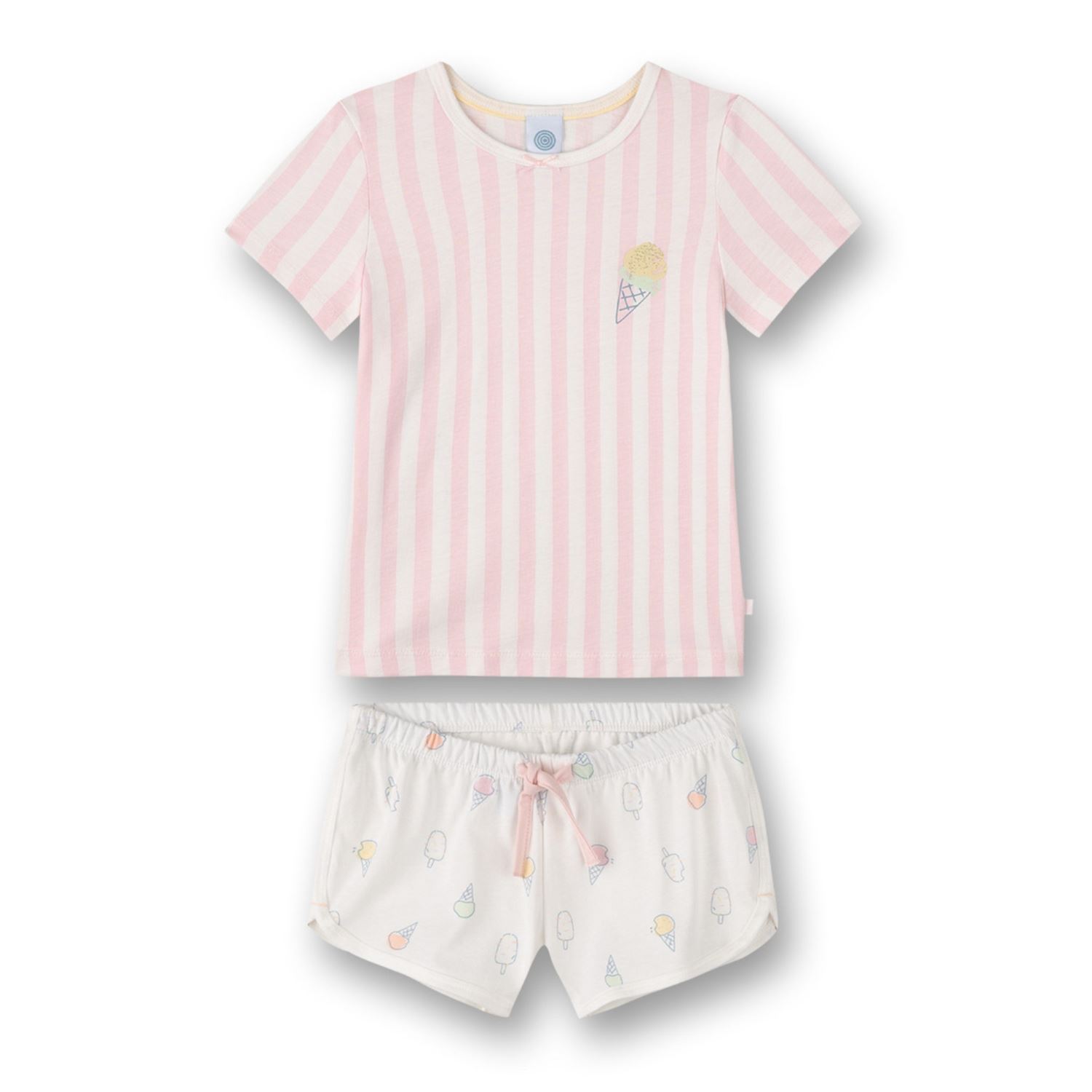 Süßer Schlafanzug für Mädchen von Sanetta. Der sommerlich kurze Schlafanzug aus 100% weicher Baumwolle hat ein fröhliches Eiscreme-Muster auf der Hose und ein kleinen Eis-Aufdruck auf dem gestreiften Shirt. Für einen idealen Sitz sorgt der elastische Taillenbund mit Bindeband.