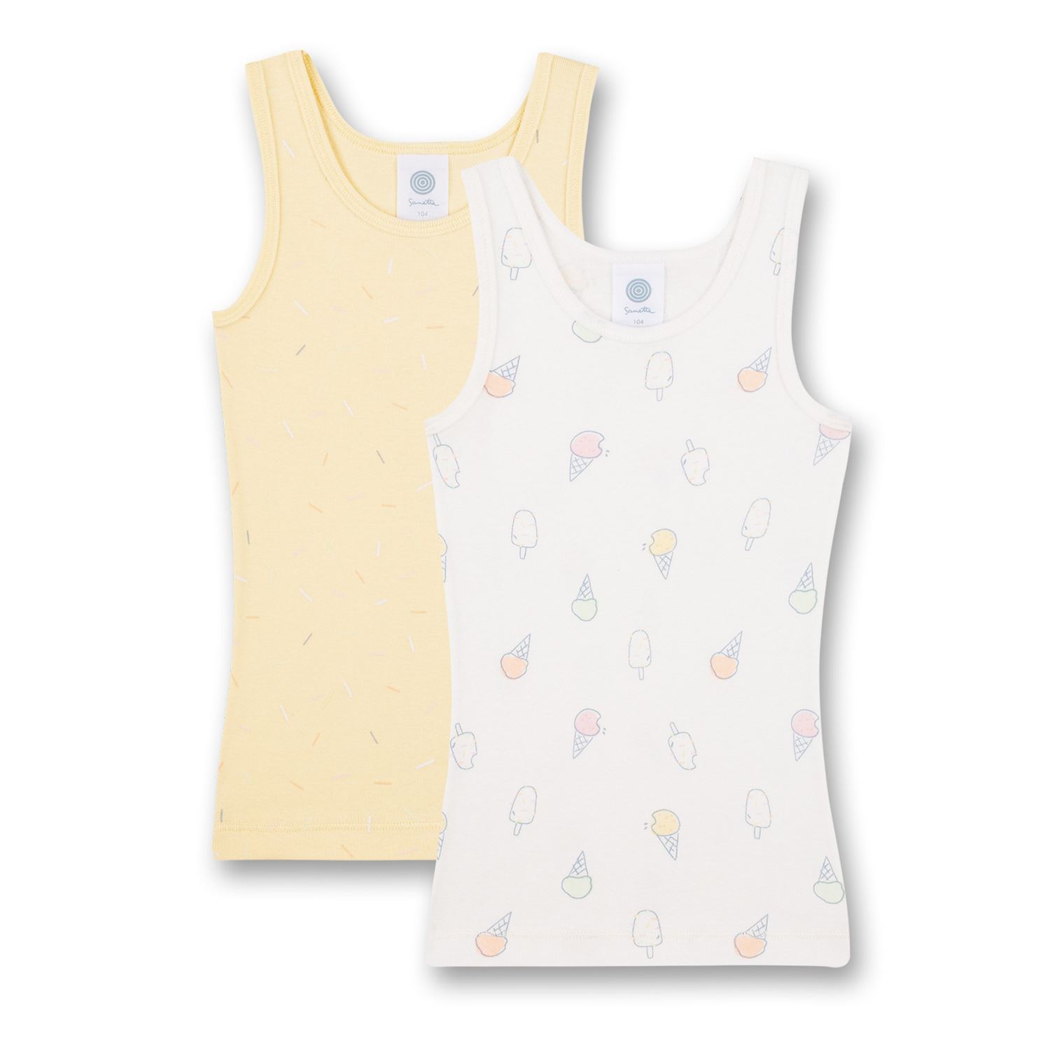 Sehr schönes Mädchen-Unterhemd mit breitem Trägern im Doppelpack von Sanetta. Der Doppelpack besteht aus einem Unterhemd mit Eis-Muster und einem Unterhemd in einem fröhlichem Gelb mit bunten Eisstreuseln. Die Unterhemden sind in weicher Feinripp-Qualität und bestehen zu 100% aus Baumwolle.