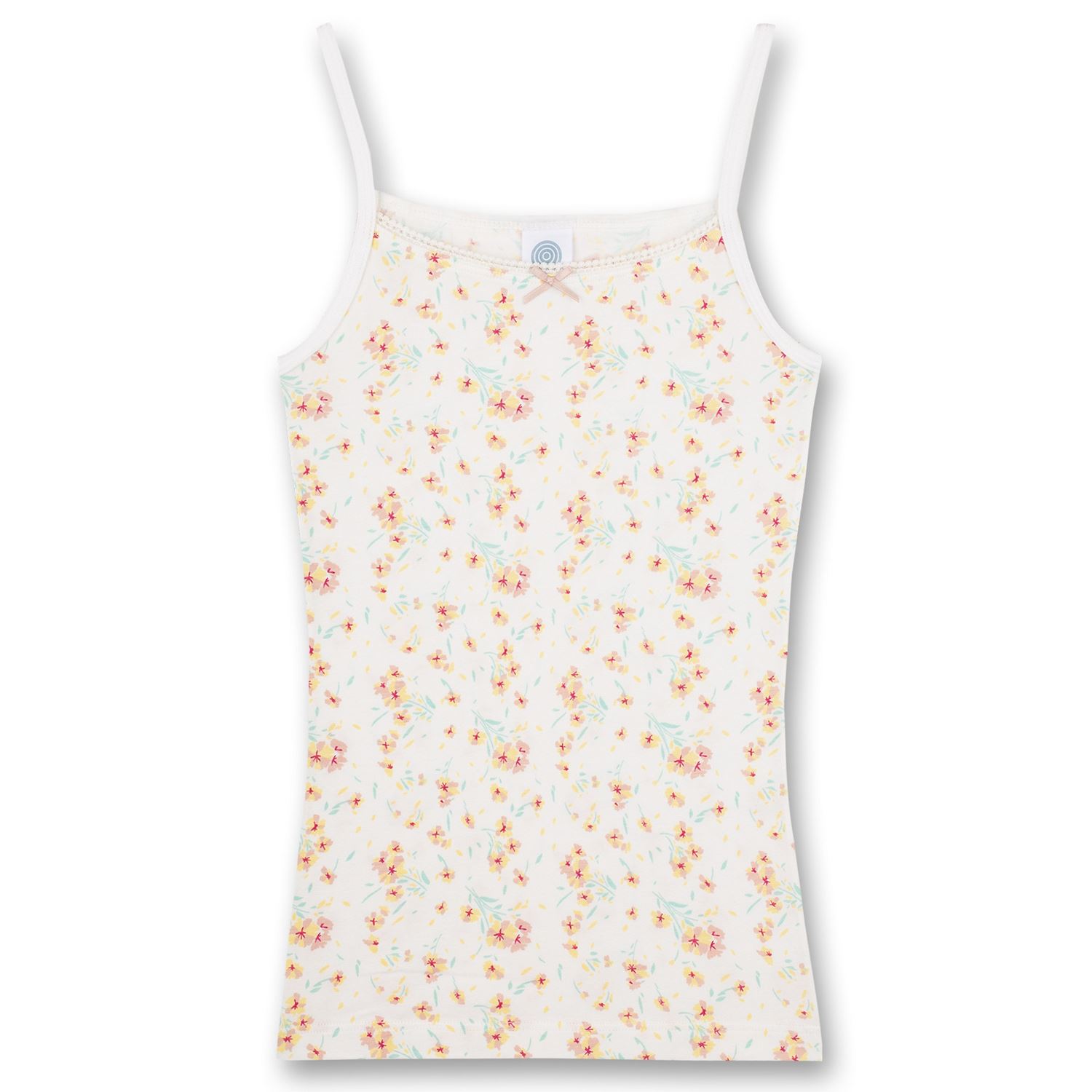 Sehr schönes Mädchen-Unterhemd mit feinen Spaghetti-Trägern von Sanetta. Das Unterhemd hat ein süßen Allover-Print mit sommerlichen Blümchen und ist in weicher Single-Qualität. Ein kleines Schleifchen ziert den Halsausschnitt. Es besteht zu 95% aus Baumwolle.