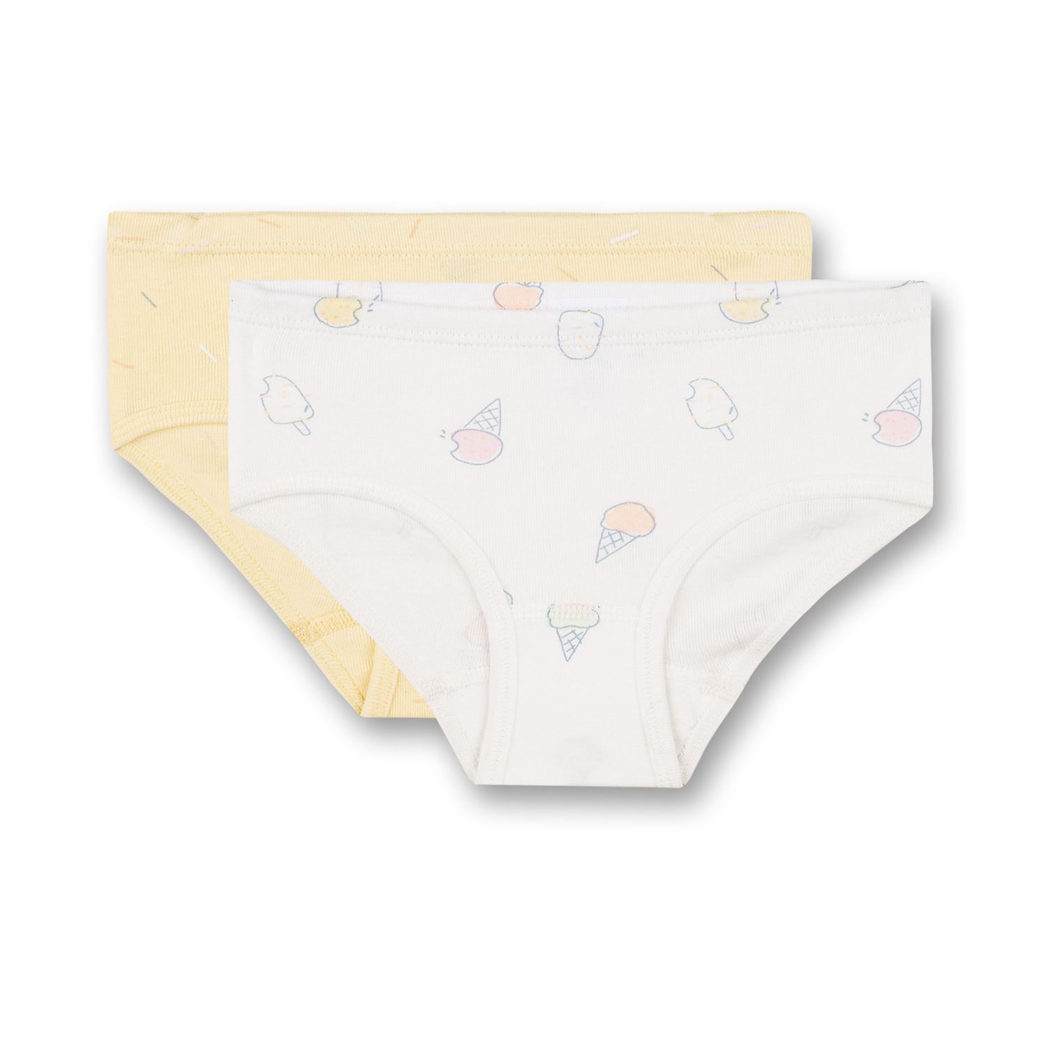 Sehr schöne Mädchen-Unterhose im Doppelpack von Sanetta. Der Doppelpack besteht aus einer Unterhose mit Eis-Muster und einer Unterhose in einem fröhlichem Gelb mit bunten Eisstreuseln. Die Unterhosen sind in weicher Feinripp-Qualität und bestehen zu 100% aus Baumwolle. Für einen idealen Sitz sorgt der elastische Taillenbund.