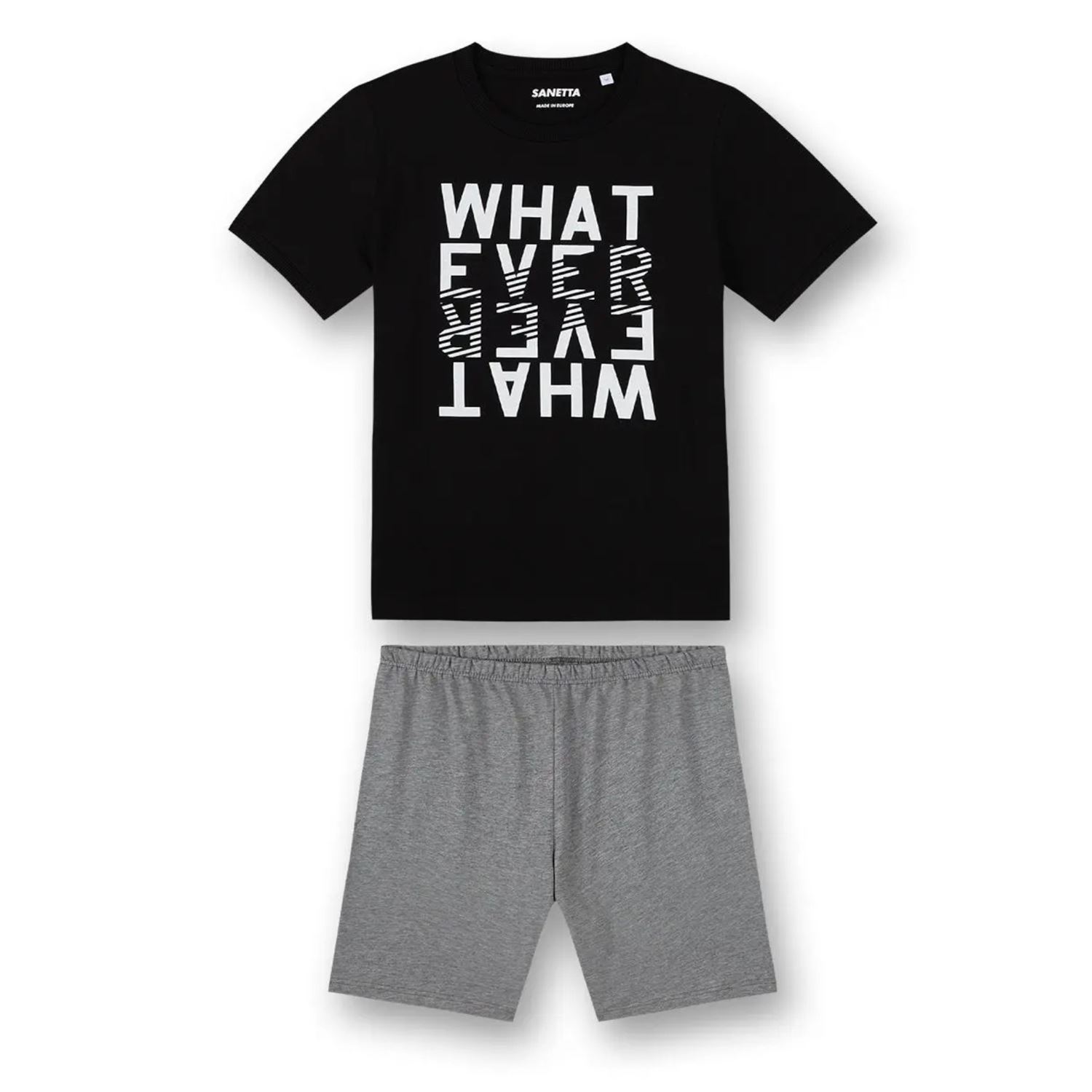 Kurzer Jungen-Schlafanzug von Sanetta mit einem stylischen Wordingprint von Sanetta.- hochwertige Single-Qualität aus 100% Baumwolle für ein angenehmes Tragegefühl- der Tragekomfort wird durch das Printlabel und das Nackenband gesteigert- Basic-Shorts in Graumelange mit einem flexiblen Taillenbund für eine optimale Passform