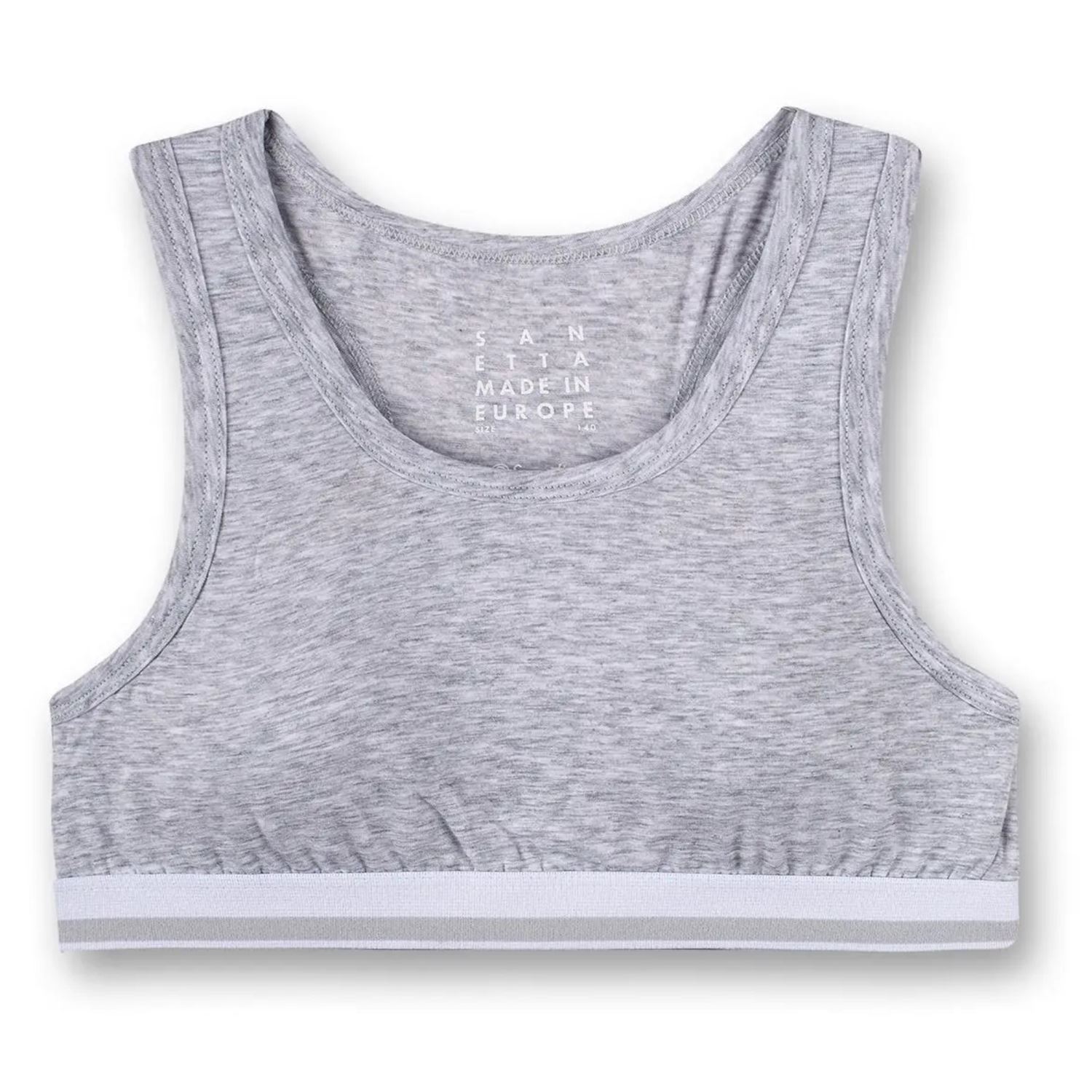 Basic-Bustier für Mädchen in Graumelange in einem sportiv lässigen Look von Sanetta.- angenehmes Tragegefühl durch elastische Single-Qualität- sportlicher Racerback für viel Bewegungsfreiheit- das elastische Unterbrustband in einer dezenten Farbigkeit sorgt für die optimale Passform ohne zu verrutschen- mit herausnehmbaren Pads- mit Sanetta LOVES YOU Printlabel im Rückenteil Eigenschaften: Made in Europe OEKO-TEX® STANDARD 100 93.0.3465 Hohenstein trocknerbeständig