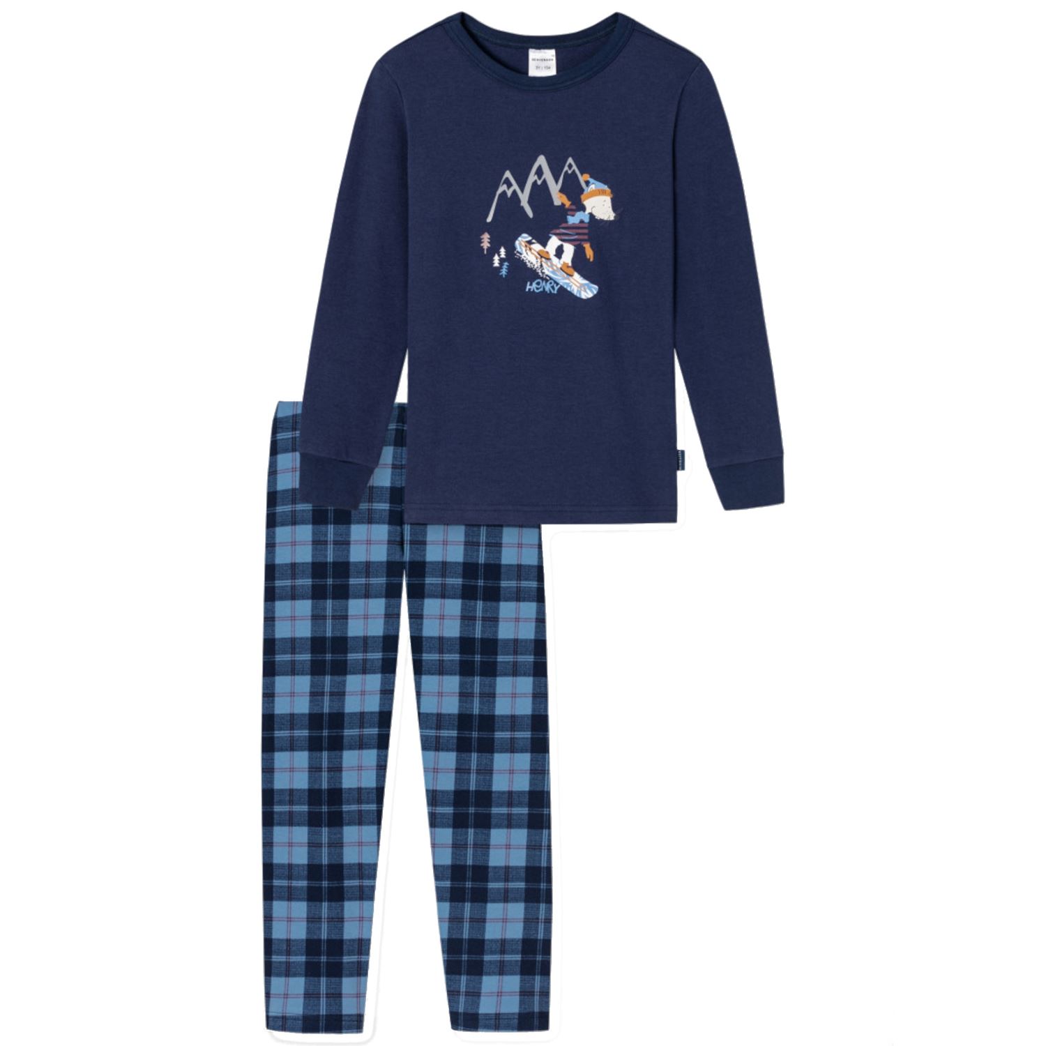 Wenn draußen der Winter einkehrt, ist dieser lange Jungenschlafanzug genau das Richtige! Das Material aus 100% weichem Interlock hält kuschelig warm und fühlt sich besonders soft auf der Haut an. Auf dem dunkelblauen Oberteil begeistert unsere Sportskanone Rat Henry als cooler Snowboardfahrer. Die bequeme Schlafhose sieht mit ihrem blauen Holzfällerkaro besonders modisch aus und sitzt dank Softbund perfekt am Körper. Ab auf die Piste in bester SCHIESSER-Qualität.- langer Schlafanzug für Jungen- aus der SCHIESSER-Serie "Rat Henry"- dunkelblaues Oberteil mit rundem Halsausschnitt und hochwertigen Armbündchen- auf der Brust mit Rat Henry-Print als Snowboardfahrer und hübscher Bergwelt- karierte Schlafhose mit Softbund in Dunkelblau und Blau- kleines SCHIESSER-Label an der Seitennaht am Oberteil- in hochwertiger, wärmender Interlock-Qualität aus 100% Organic Cotton