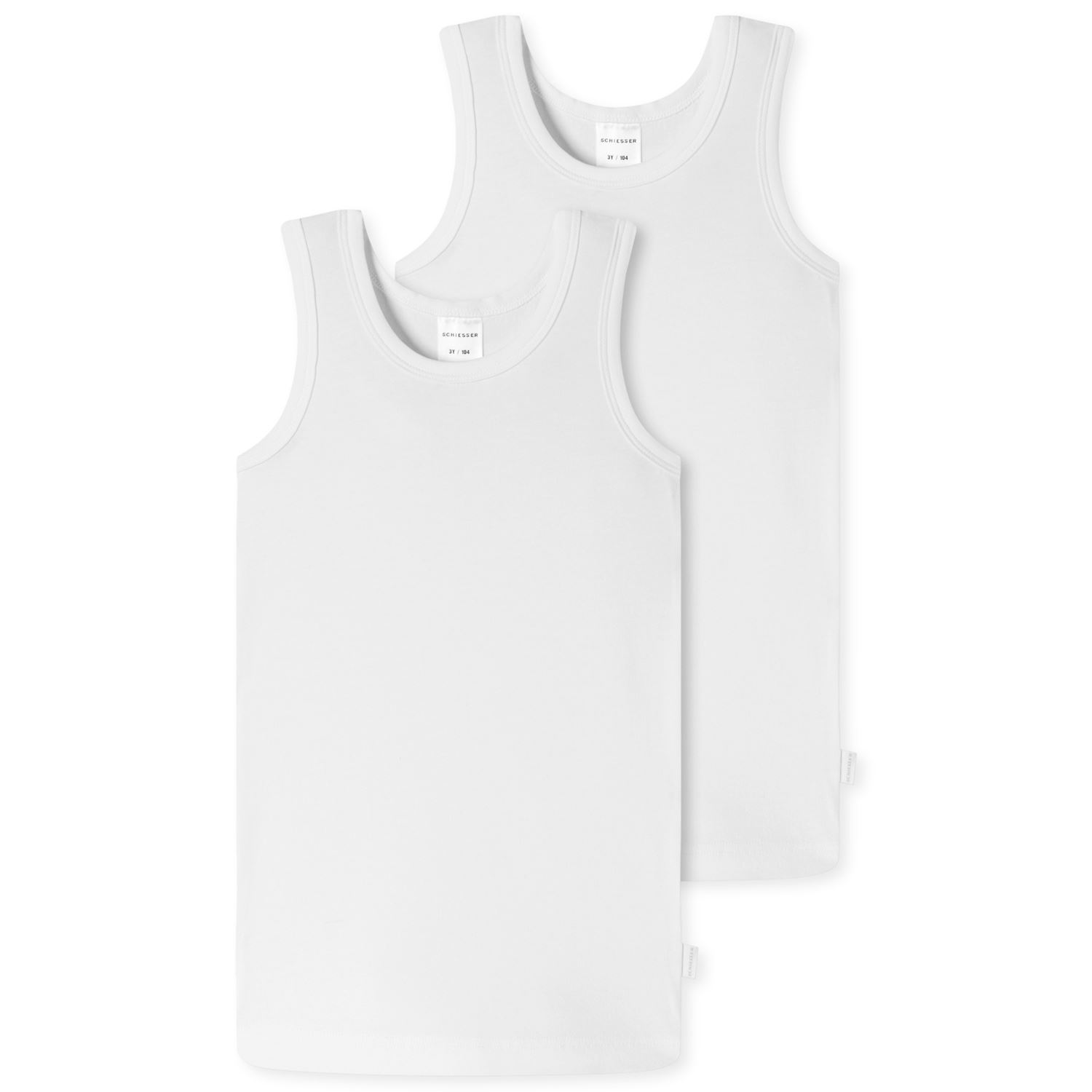 Weiße Unterhemden für Jungen, aus der beliebten SCHIESSER-Serie "95/5", im praktischen Doppelpack, mit Rundhalsauschnitt und tonalen Hals- und Armeinfässen, kleines 95/5-Logo an der Seitennaht, extra hautfreundlich für höchsten Tragekomfort, in perfekt si