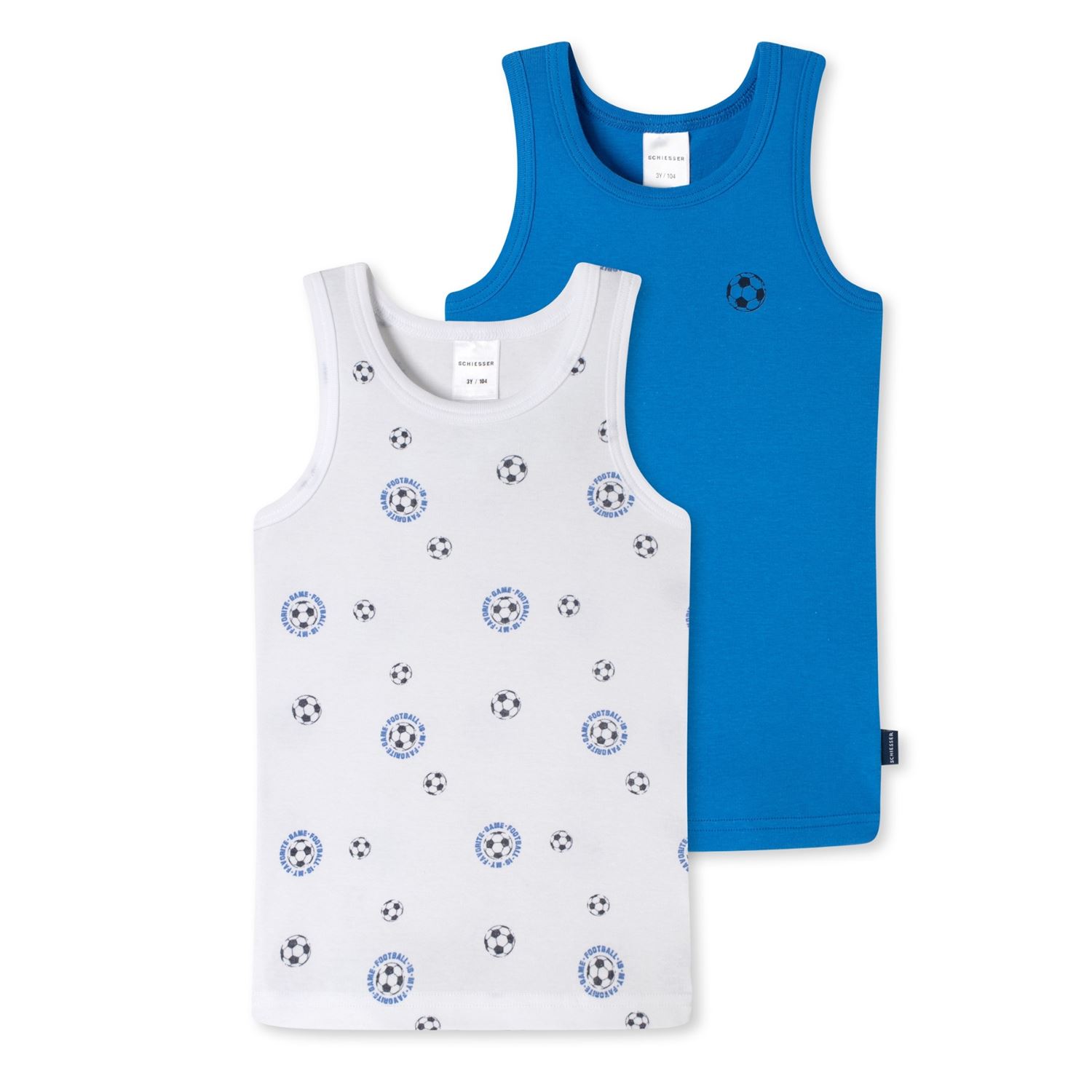 Sportliches Jungen-Unterhemd mit Fußball-Motiv im Doppelpack von Schiesser. Das Set besteht aus einem weißen Unterhemd mit Allover-Print von Fußbällen und einem blauen Unterhemd mit einem kleinen aufgedruckten Fußball auf der Brust. Die Unterhemden mit Rundhalsausschnitt sind aus 100% Baumwolle in weicher Feinripp-Qualität.
