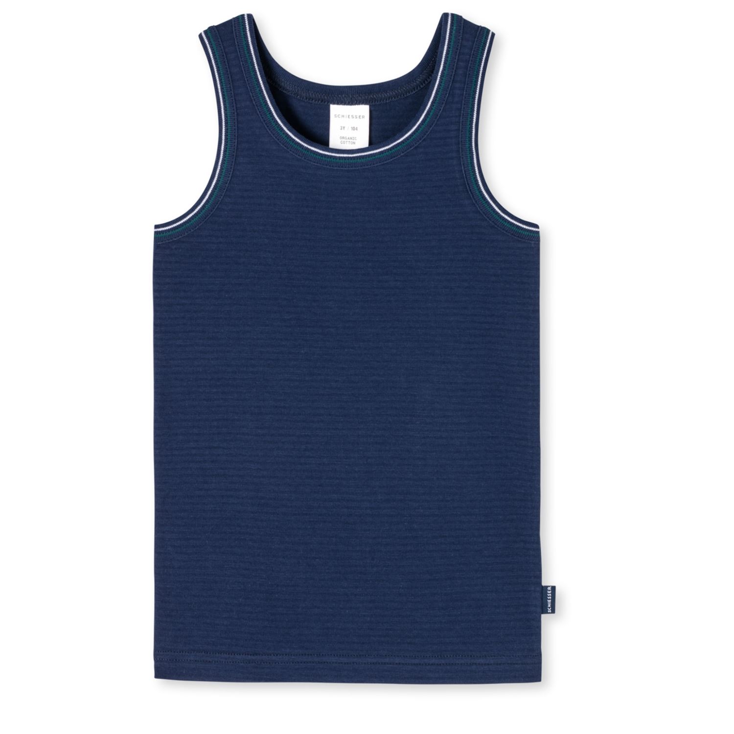 Ein echter Hingucker ist dieses dunkelblaue Jungen-Unterhemd. Das modische Ringel-Muster verleiht der Tagwäsche einen besonders frischen und sportlichen Look. Am Hals- und Armausschnitt mit feinen weißen und grünen Streifen sorgt zusätzliches Elastan für ganz viel Bequemlichkeit und Komfort. Bester Single Jersey Jacquard aus natürlichem Organic Cotton fühlt sich herrlich weich auf der empfindlichen Kinderhaut an. Perfekt um den Tag in bester SCHIESSER-Qualität zu genießen!