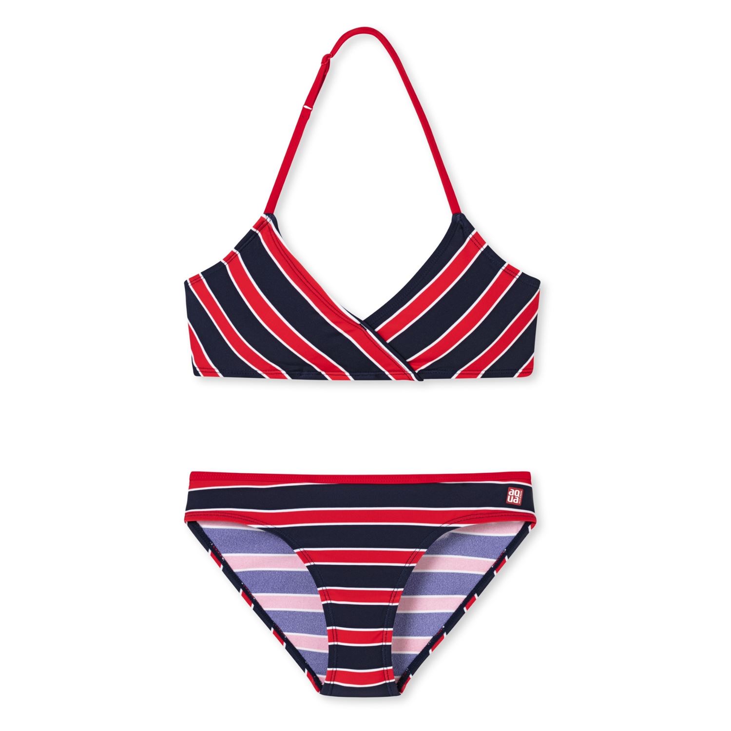 Rot-Blau gestreifter Triangel-Bikini für Mädchen von Schiesser. Der Bikini besteht aus gepaddetem Oberteil, dieses ist im Nackenbereich verstellbar, und aus einem Rio-Slip. Der Bikini hat einen zuverlässigen UV-Schutz 40+.