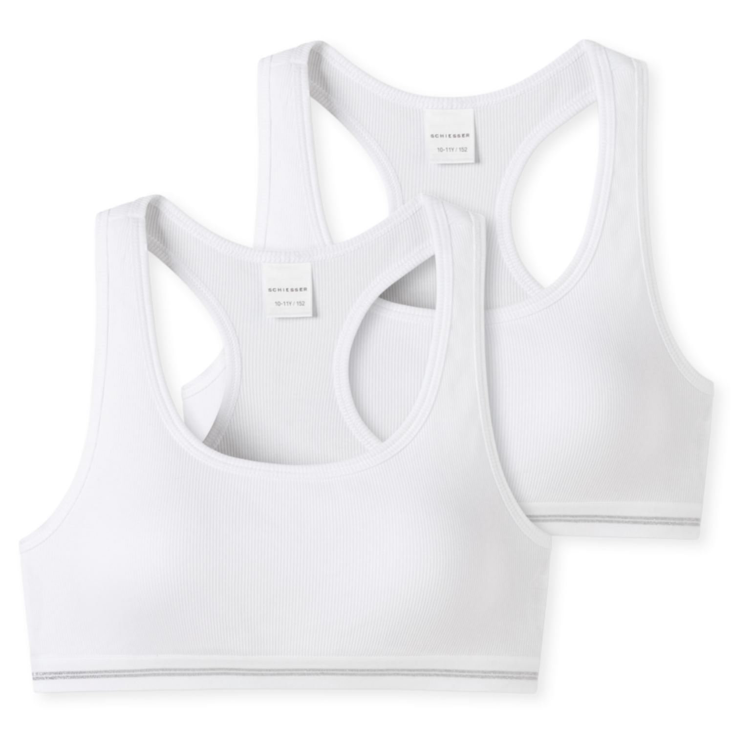 Sie mögen Baumwolle? Dann werden Sie Long Life Cotton lieben! Eine Produktinnovation, mit der SCHIESSER Langzeitqualität neu definiert. Ein natürlicher Veredelungsprozess revolutioniert Haptik und Optik Ihrer Unterwäsche, sodass sie auch nach vielen Waschgängen noch aussieht wie neu. So wie bei diesen weißen Mädchen-Bustiers im Doppelpack, die mit pilling-armem, glattem Single Jersey und einer optimalen Passform auf ganzer Linie durch beste SCHIESSER-Qualität überzeugen! - weiße Bustiers für Mädchen im praktischen Doppelpack - aus der SCHIESSER-Serie "Long Life Cotton" - mit sportlichem Racerback-Rückteil - Unterbrust mit Webgummi und eingegewebten, schimmernden Lurex-Fäden - höchste Qualität und Langlebigkeit durch einzigartige ReaLasting Cotton-Verarbeitung - sieht auch nach vielen Wäschen noch aus, wie neu! - in herrlich bequemer, elastischer Doppelripp-Qualität