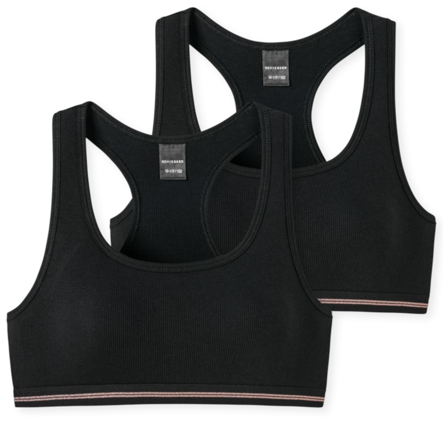 Sie mögen Baumwolle? Dann werden Sie Long Life Cotton lieben! Eine Produktinnovation, mit der SCHIESSER Langzeitqualität neu definiert. Ein natürlicher Veredelungsprozess revolutioniert Haptik und Optik Ihrer Unterwäsche, sodass sie auch nach vielen Waschgängen noch aussieht wie neu. So wie bei diesen schwarzen Mädchen-Bustiers im Doppelpack, die mit pilling-armem, glattem Single Jersey und einer optimalen Passform auf ganzer Linie durch beste SCHIESSER-Qualität überzeugen! - schwarze Bustiers für Mädchen im praktischen Doppelpack - aus der SCHIESSER-Serie "Long Life Cotton" - mit sportlichem Racerback-Rückteil - Unterbrust mit Webgummi und eingegewebten, schimmernden Lurex-Fäden - höchste Qualität und Langlebigkeit durch einzigartige ReaLasting Cotton-Verarbeitung - sieht auch nach vielen Wäschen noch aus, wie neu! - in herrlich bequemer, elastischer Doppelripp-Qualität