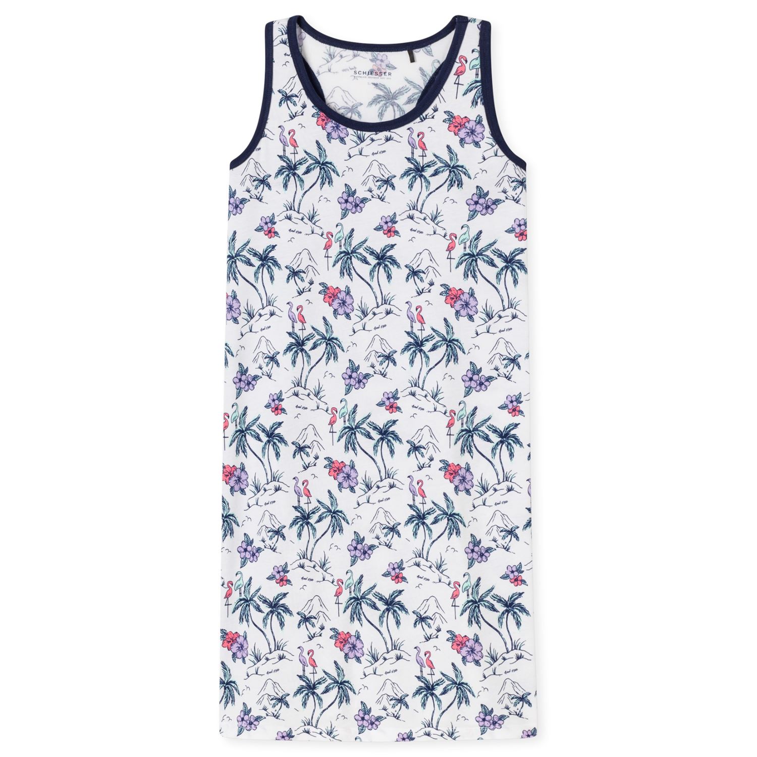 Sommerliches Schlafshirt für Mädchen von Schiesser. Das ärmellose Nachthemd ist aus weichem Baumwoll-Modal-Gemisch und hat einen modischen Allover-Print mit Palmen und Flamingos.