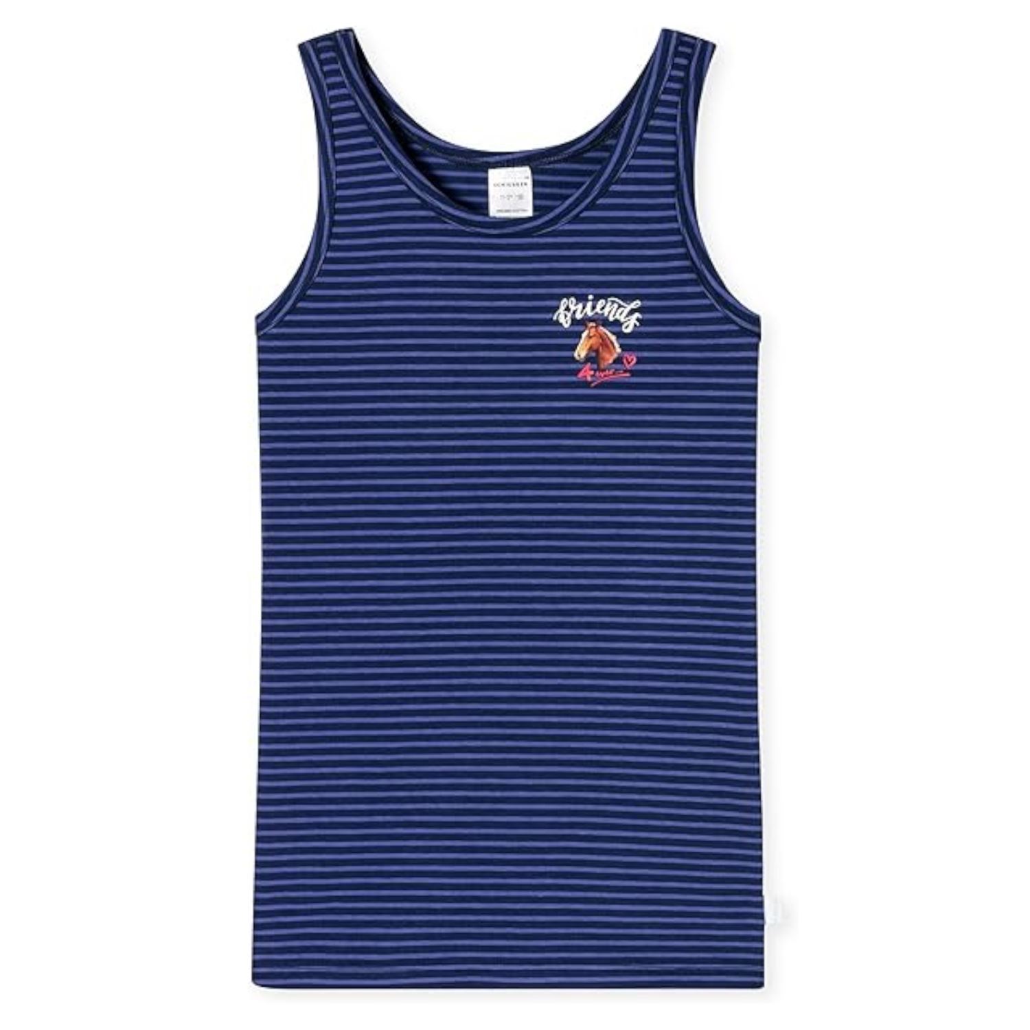 Mit diesem schönen dunkelblau geringelten Unterhemd für Mädchen präsentiert sich die Serie "Horse World" aus dem Hause SCHIESSER. Es ist im College-Style mit dunkelblauen Ringeln und kleinen Pferdemotiv "Horse Camp" auf der Brust gestaltet worden. Da es aus weichem, elastischen Single-Jersey mit bester Bio-Baumwolle besteht, fühlt es sich angenehm auf der Haut an.